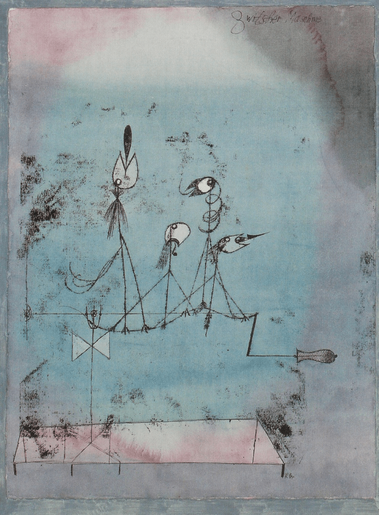 Twittering Machine (Die Zwitscher-Maschine) is a 1922 watercolor with gouache, pen-and-ink, and oil transfer on paper by Swiss-German painter Paul Klee